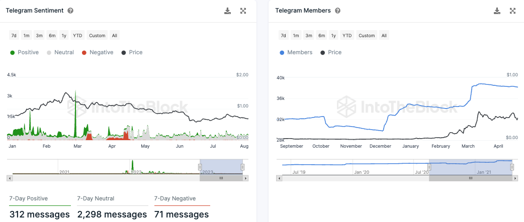 Die Stimmung rund um Polygon auf Telegram ist größtenteils positiv, mit einem Verhältnis von positiven zu negativen Nachrichten von mehr als 4 zu 1. Es wurden 312 positive Nachrichten im Vergleich zu 71 negativen verzeichnet. Es ist jedoch zu beachten, dass die Anzahl der Telegram-Nutzer seit 2021 deutlich zurückgegangen ist.