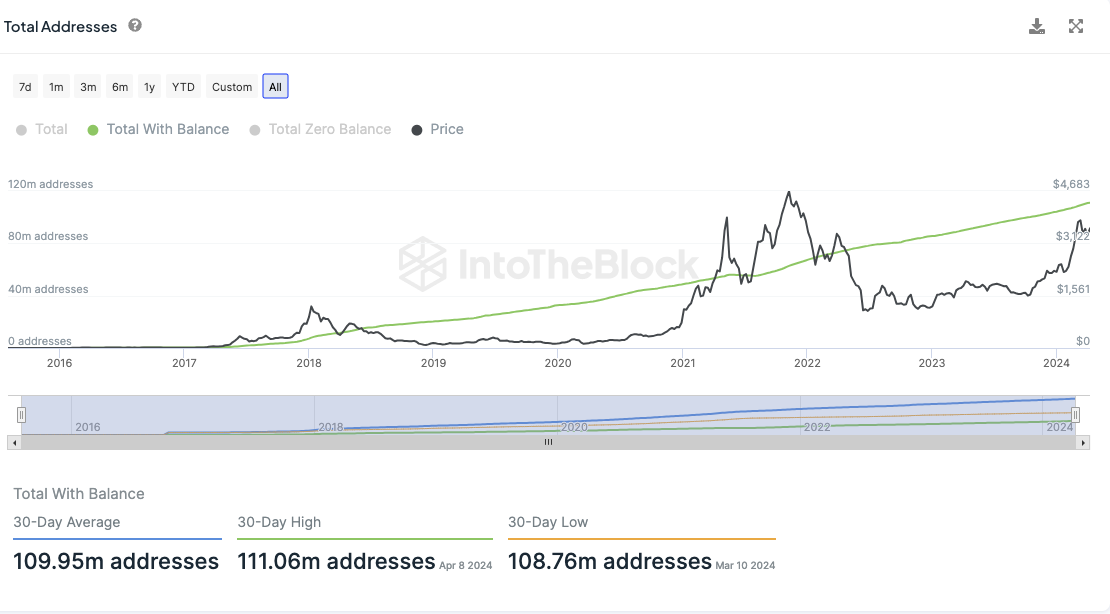 Insgesamt verzeichnet das Ethereum Netzwerk aber ein beständiges Wachstum. In den letzten 30 Tagen wurden durchschnittlich 101 Millionen ETH Adressen gezählt, die ein ETH Guthaben aufweisen.