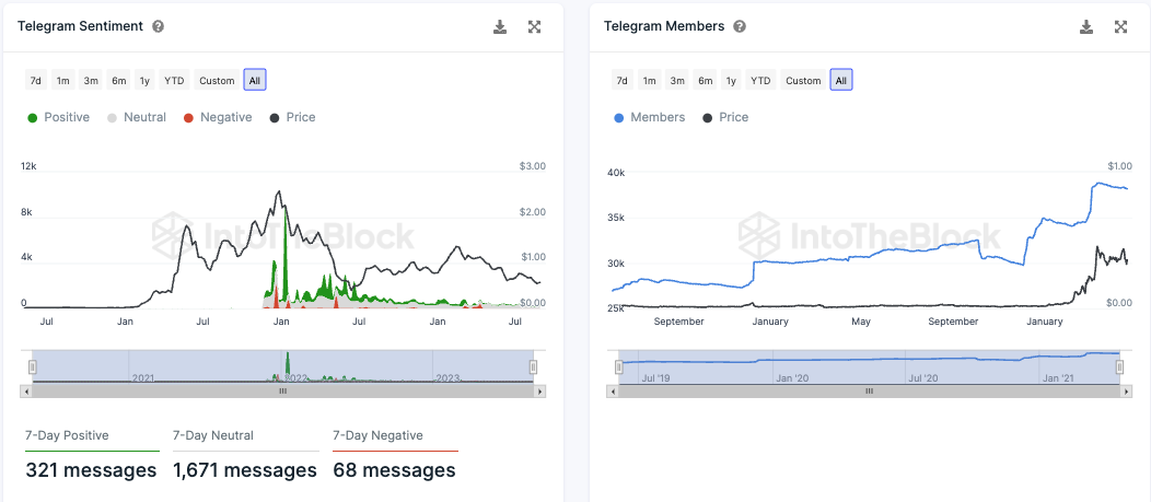 Die Stimmung rund um Polygon auf Telegram ist überwiegend positiv, mit einem Verhältnis von positiven zu negativen Nachrichten von fast 5 zu 1. Es wurden 321 positive Nachrichten im Vergleich zu 68 negativen gezählt. Die Mitgliederanzahl der Polygon Telegram Gruppe ist seit 2021 aber deutlich zurückgegangen.