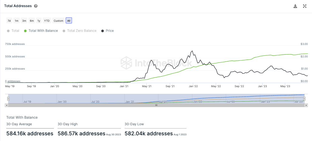 Nichtsdestoweniger wächst die Anzahl an MATIC Adressen im Polygon Netzwerk weiterhin. Seit der letzten Analyse ist die Anzahl um 4.000 Adressen gewachsen. In den letzten 30 Tagen wurden dabei durchschnittlich rund 584.000 Adressen gezählt.