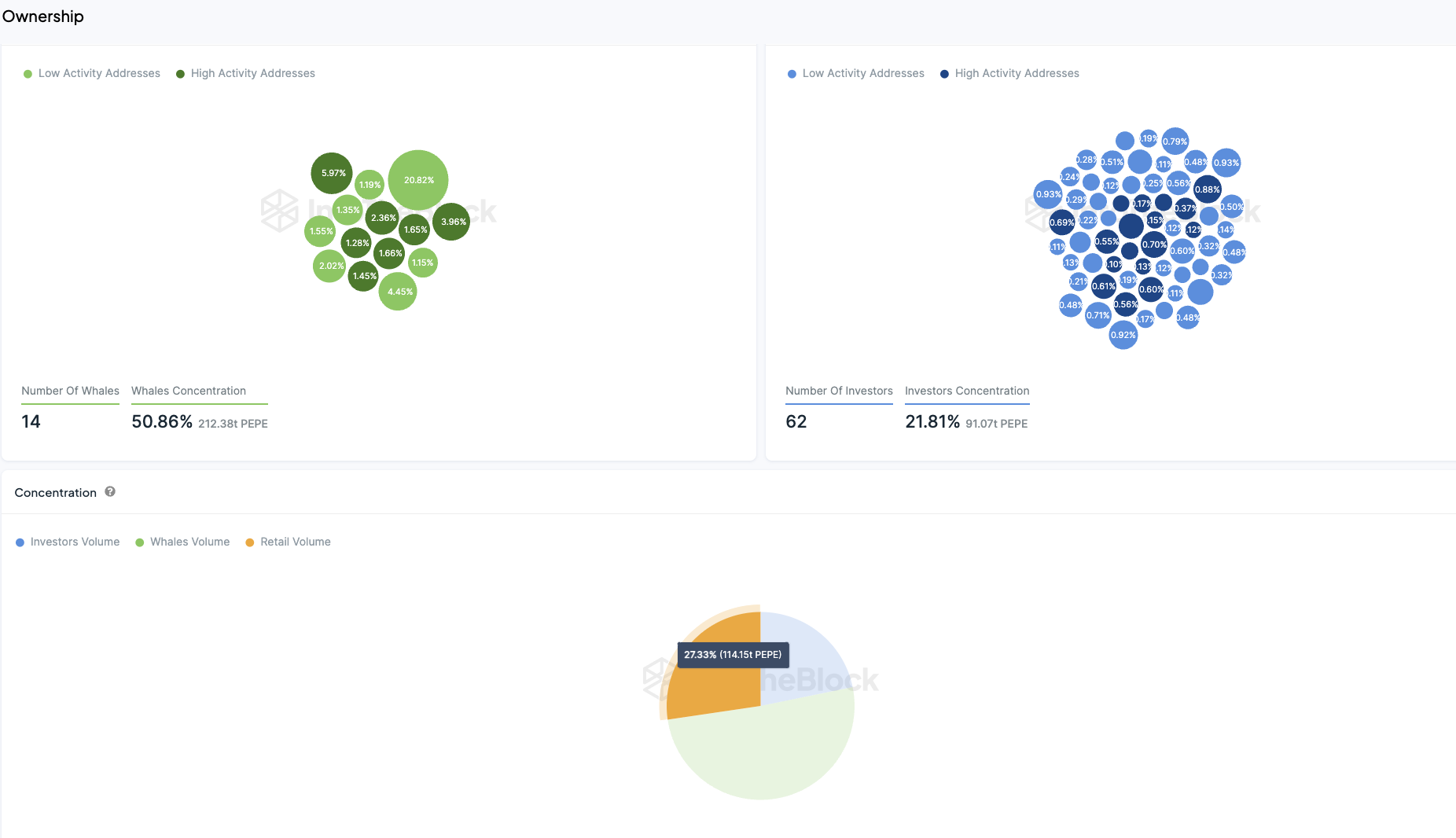 PEPE wird dabei vor allem von Walen gehalten. 14 Wal-Adressen, die jeweils mehr als 1 % der Token Supply halten, halten zusammen rund 51 % der gesamten Token Supply. Sieben Adressen davon sind sogar Adressen mit sehr hoher Aktivität.