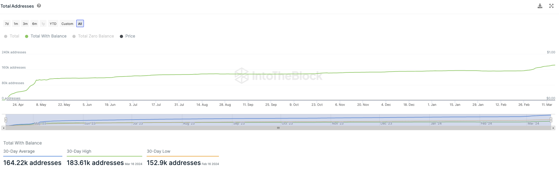 Seit diesem Monat verzeichnet das PEPE Netzwerk wieder ein starkes Wachstum. So wurden in den letzten 30 Tagen rund 164.000 Adressen gezählt, die ein PEPE Wachstum aufweisen. Das sind knapp 20.000 mehr als noch vor zwei Monaten.