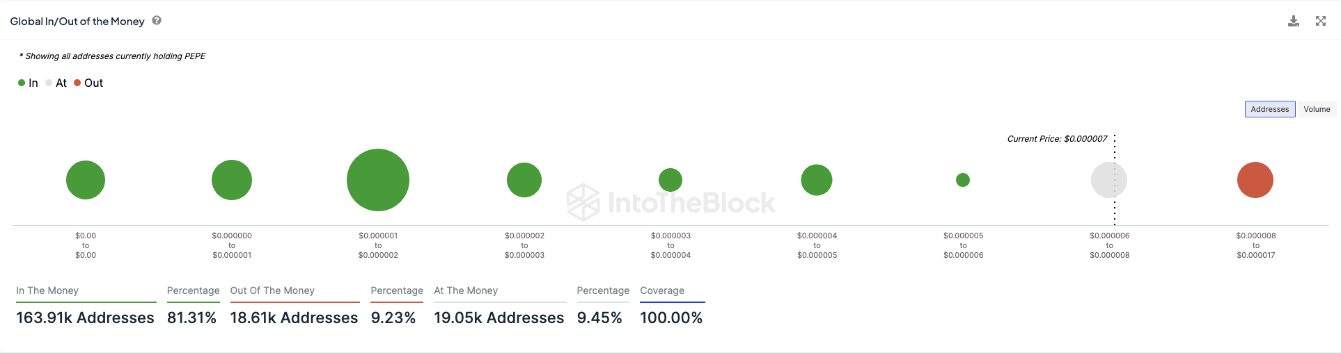 Die überragende Mehrheit von über 81 % an PEPE Adressen ist im grünen Bereich. Nur ein kleiner Anteil würde beim Verkauf Verluste machen.