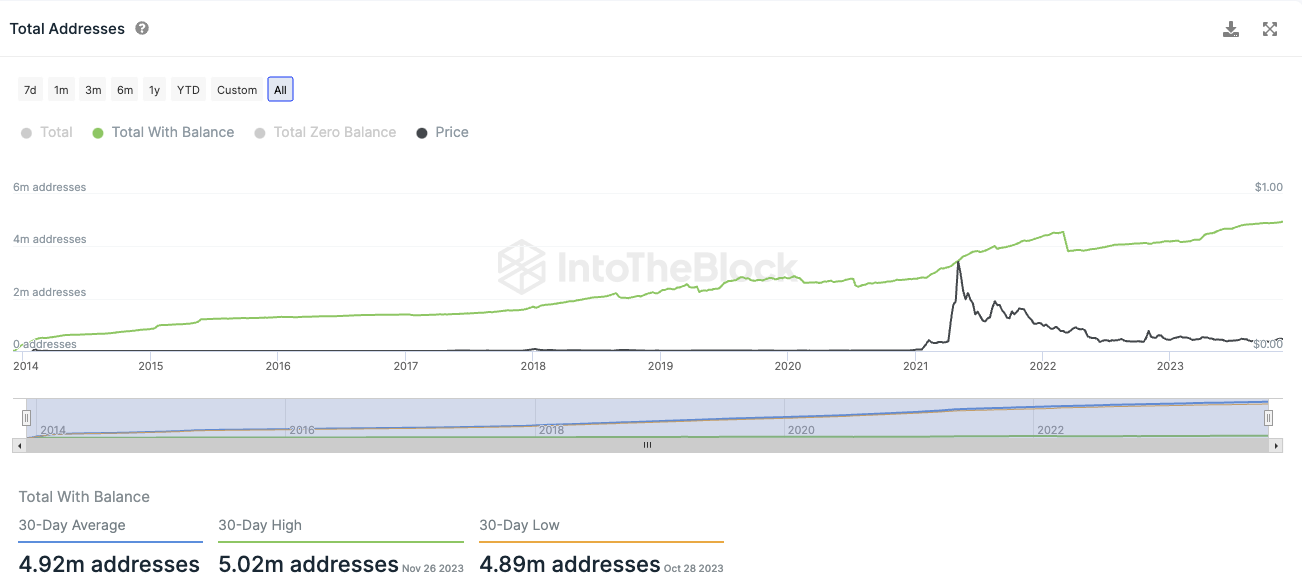 Das Dogecoin Netzwerk weist weiterhin einen Aufwärtstrend auf. In den letzten 30 Tagen wurden durchschnittlich rund 4,92 Millionen Adressen mit DOGE Guthaben gezählt. Zwischenzeitlich lag die Zahl sogar bei rund 5,02 Millionen Adressen.