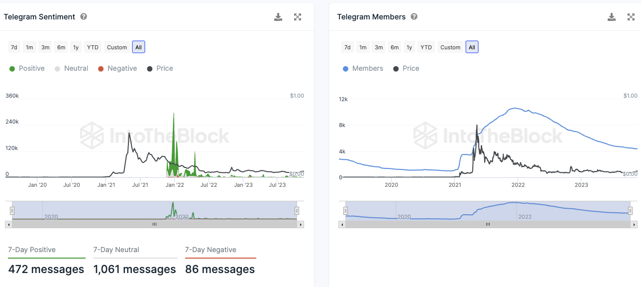Die Anzahl der positiven Nachrichten zu Dogecoin auf Telegram übersteigt die der negativen um mehr als das Fünfache. So stehen knapp 472 positive Nachrichten 86 negativen Nachrichten gegenüber. Trotzdem weist die Dogecoin Telegram Gruppe seit dem Ende des Jahres 2021 einen deutlichen Mitgliederschwund auf.