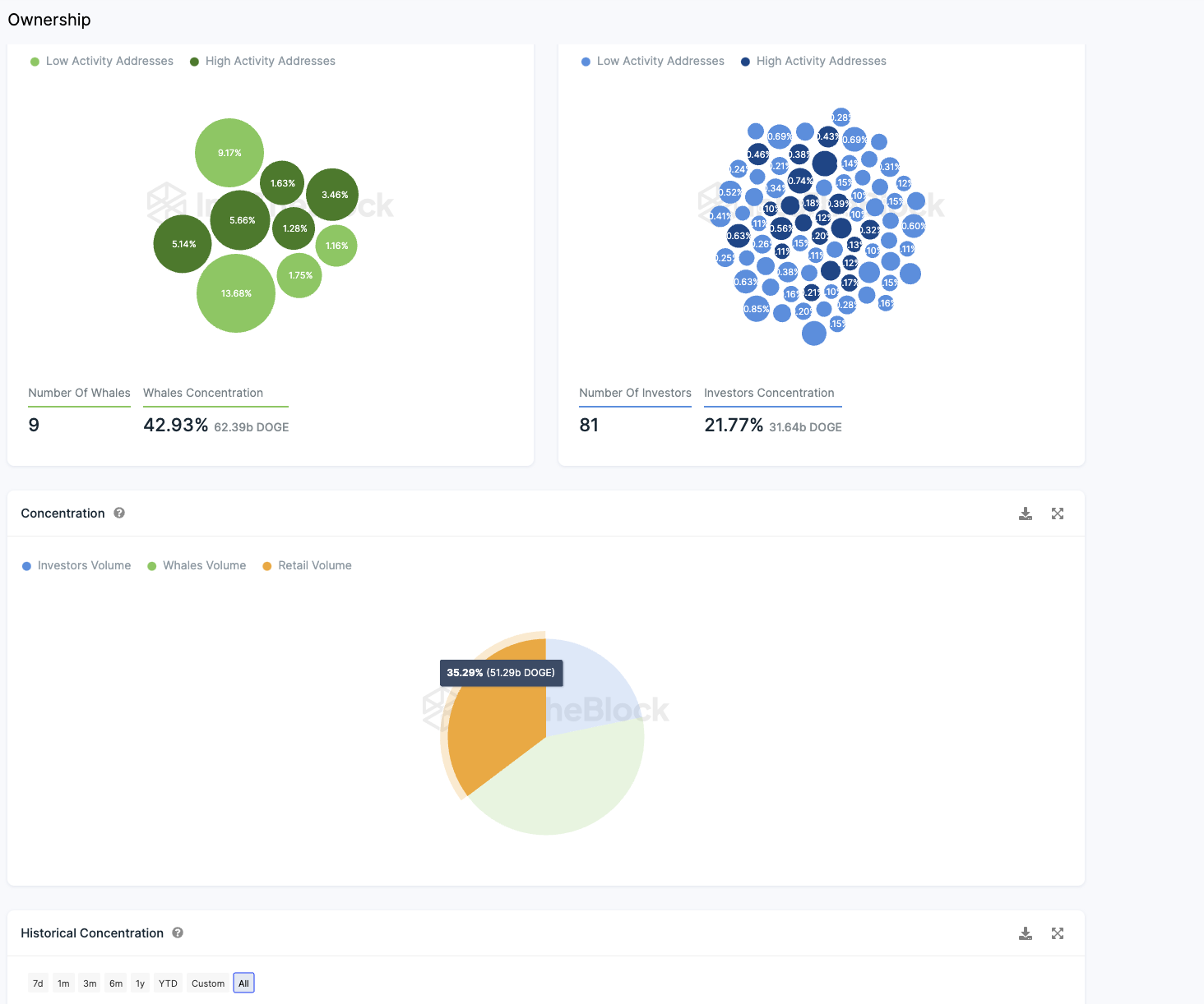 Betrachtet man die Eigentumsverhältnisse zu Dogecoin, fällt ein Wachstum an Großinvestoren auf. Zum Zeitpunkt der letzten Analyse besaßen noch rund 73 Großinvestoren rund 21 % aller verfügbaren Token.