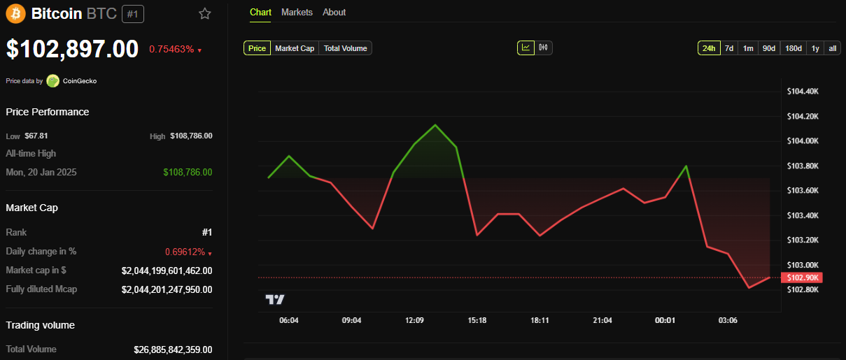 Bitcoin wurde bei 102.897 USD gehandelt, wobei Analysten vorschlagen, dass eine staatliche Akkumulation erneuten Aufwärtsdruck auf den Kurs des digitalen Assets auslösen könnte.