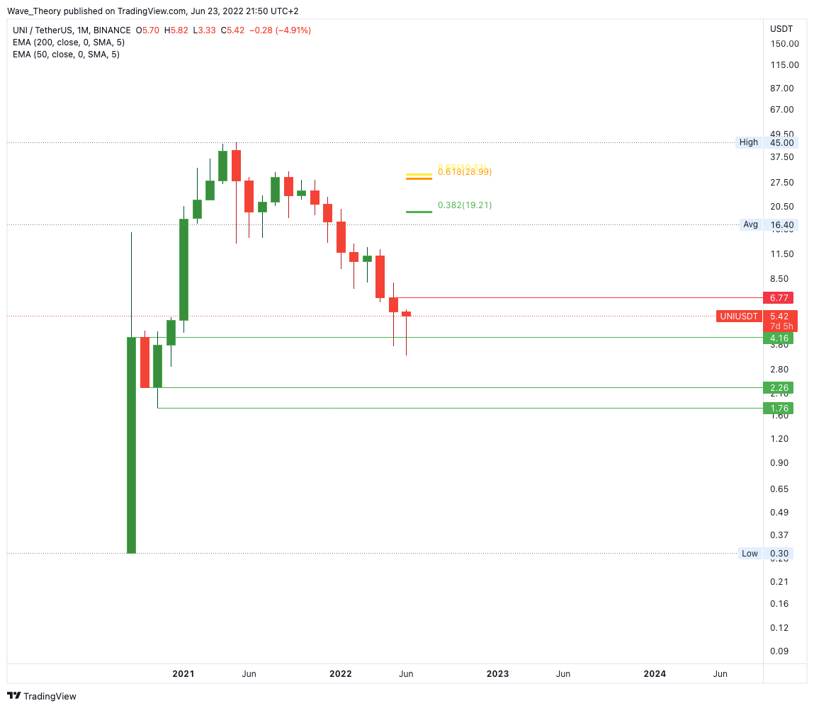 Um einen bullischen Trendwechsel zu vollziehen und die Korrektur zu beenden, müsste UNI die Golden Ratio bei rund 29 USD brechen. Für eine bullische Kerzenformation im Monatschart müsste UNI zumindest über 6,77 USD schließen.