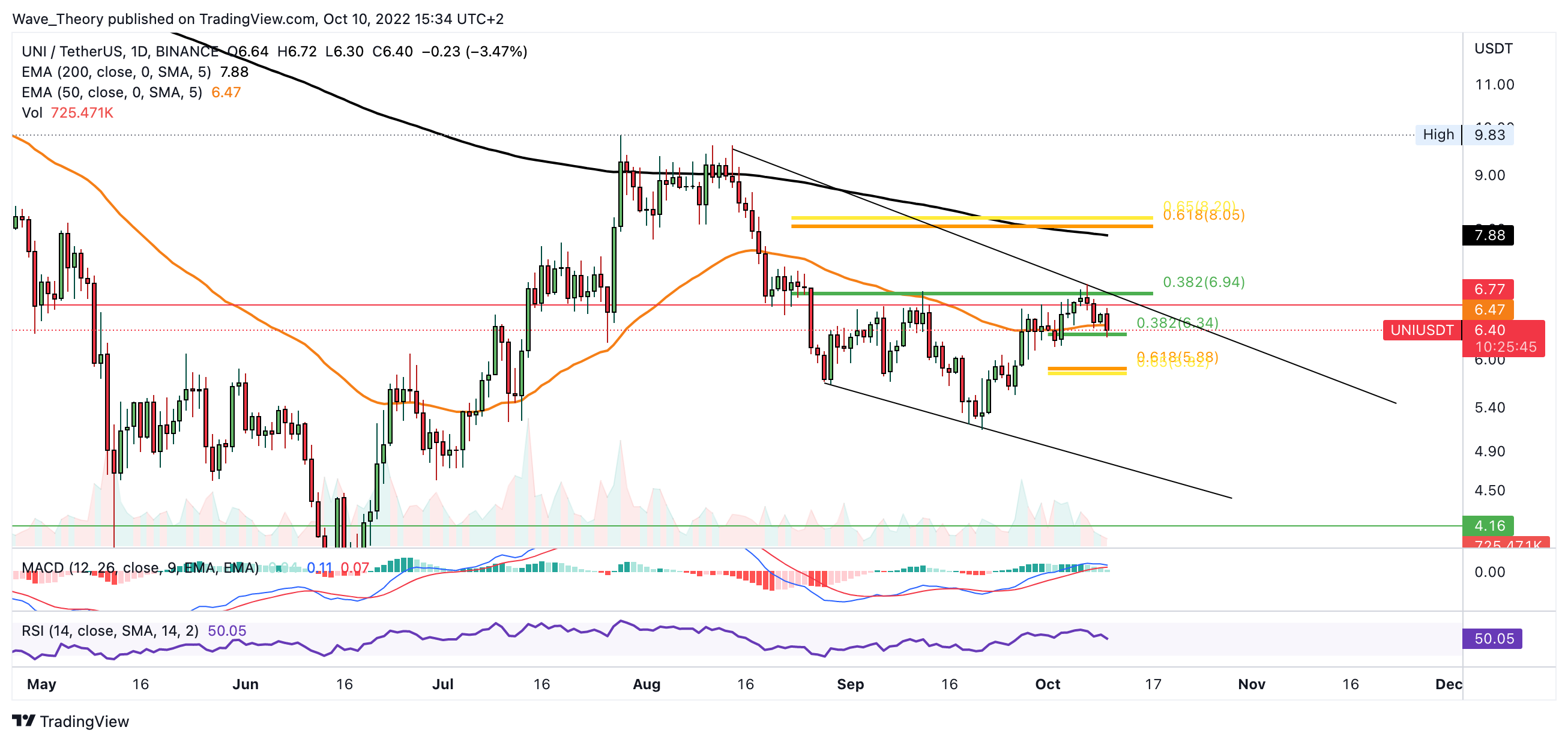 Aktuell rangiert der Uniswap Kurs damit zwischen dem Golden Ratio Widerstand bei rund 9 USD und der Golden Ratio Unterstützung bei rund 5,8 USD. Mit der bärischen Abweisung an der Golden Ratio bei rund 9 USD zeigt sich der Uniswap Kurs aber eher bärisch. Denn damit wurde der Bärentrend bestätigt.
