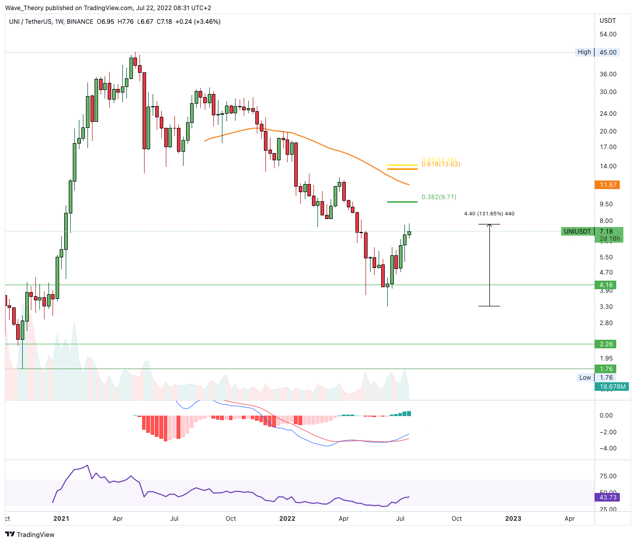 “Seit letzter Woche konnte der UNI Preis rund 71 % steigen. Dies könnte tatsächlich erst der Anfang sein, denn die aktuelle Wochenkerze ist bisher extrem bullisch. Sollte der UNI Kurs den 50-Tage-EMA Widerstand bei 5,44 USD jetzt brechen, könnte UNI zum 0,382 Fib Widerstand bei 6,85 USD steigen. Bricht UNI auch diesen Fibonacci Widerstand, so wartet bei rund 9 USD der nächste signifikante Fib Widerstand auf UNI.”
