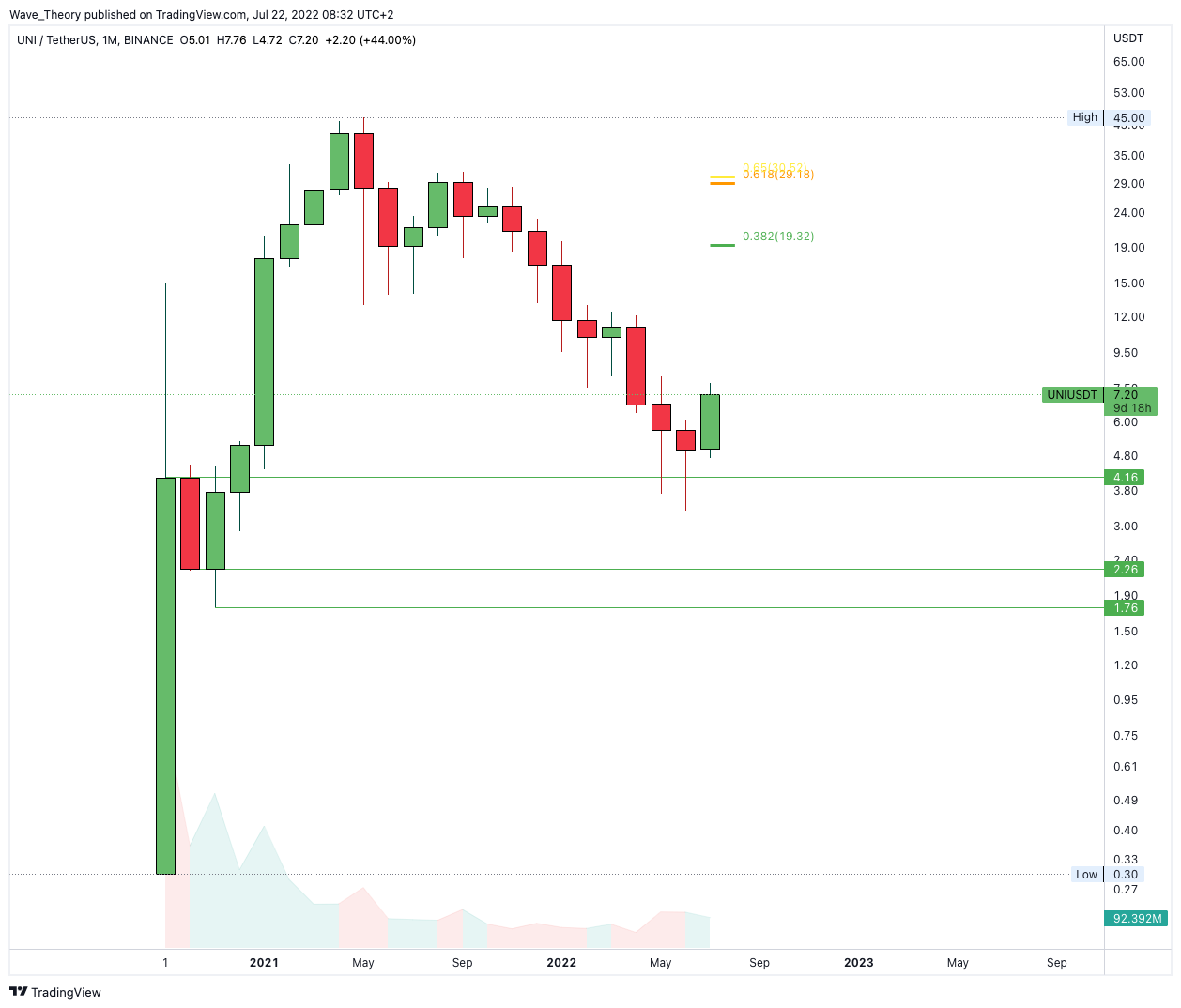 Der Juli verläuft sehr bullisch für den Uniswap Kurs. Tatsächlich ist dies der bullischste Monat seit über elf Monaten. Das könnte durchaus den Beginn einer längeren Aufwärtsbewegung markieren. Damit besteht auch die Chance, dass Uniswap bei 3,33 USD seinen Boden gefunden hat.