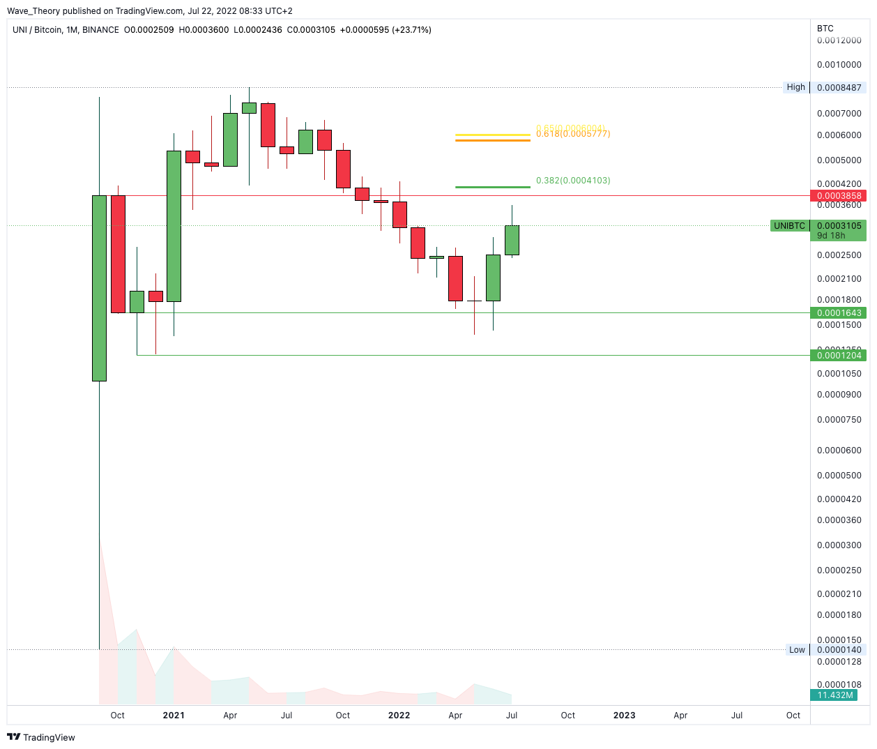 Gegen BTC nähert sich der Uniswap Kurs 0,382 Fib Widerstand
