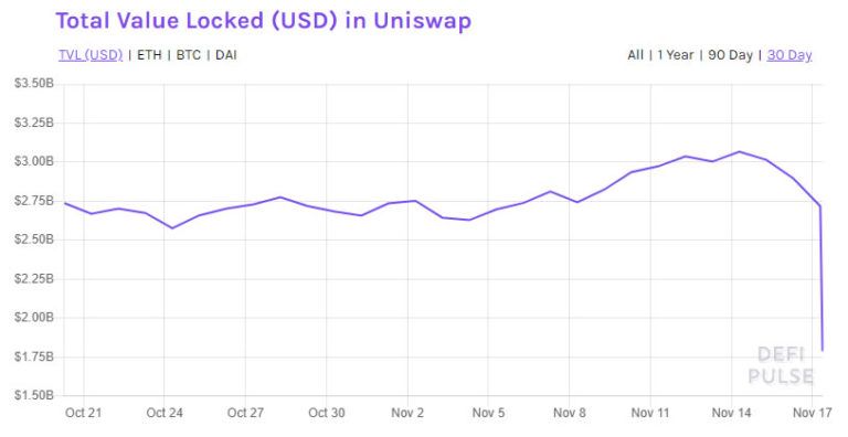 Von einem Allzeithoch von etwas mehr als 3 Milliarden USD in der vergangenen Woche hat Uniswap laut DeFi Pulse 40% seiner Sicherheiten in einem starken Rückgang auf 1,8 Milliarden USD verloren.