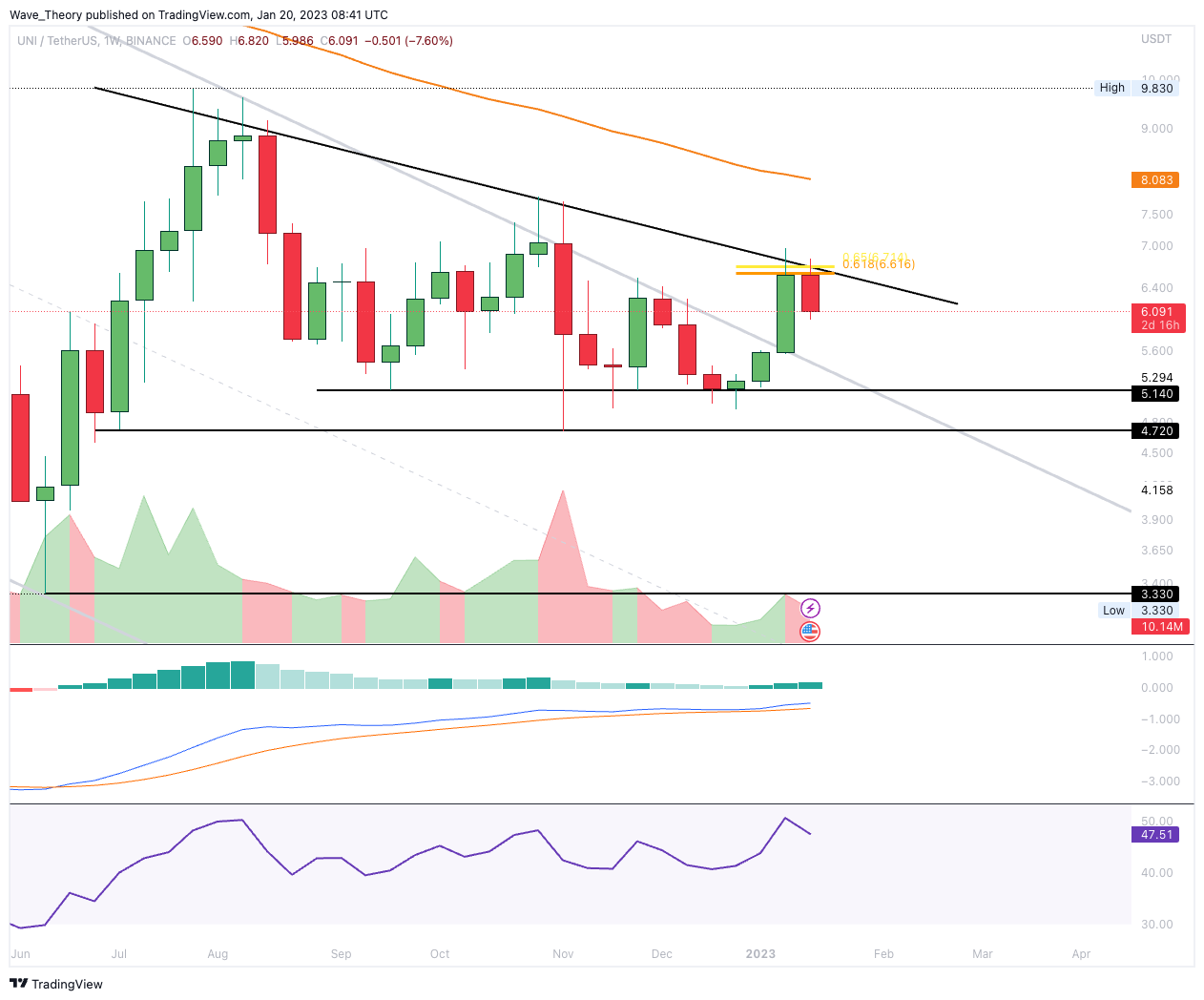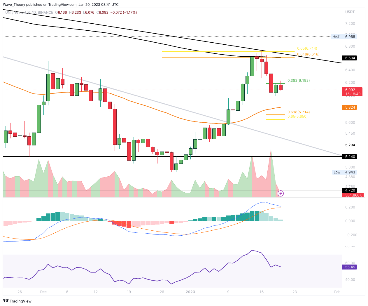 Bullisch ist hingegen, dass das Handelsvolumen wieder kräftig zugenommen hat. Dennoch hat UNI bereits die Fib Unterstützung bei rund 6,19 USD bärisch gebrochen, womit nun die nächste signifikante Unterstützung zwischen rund 5,6 USD und 5,8 USD wartet. Denn dort liegt Golden Ratio Unterstützung und der 50-Tage-EMA, welcher als zusätzliche Unterstützung dient.