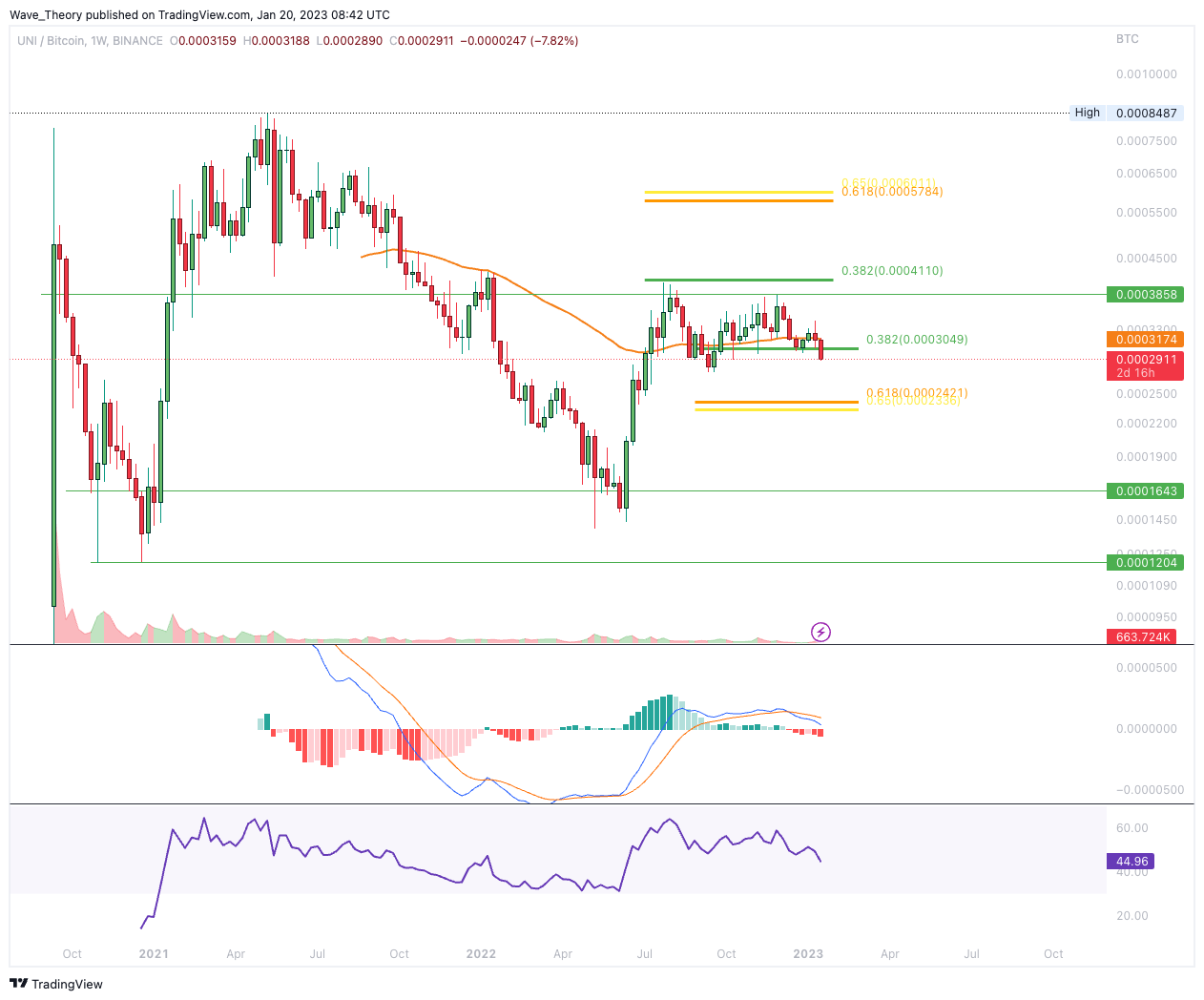 Gegen BTC bricht Uniswap die 0,382 Fib Unterstützung bärisch
