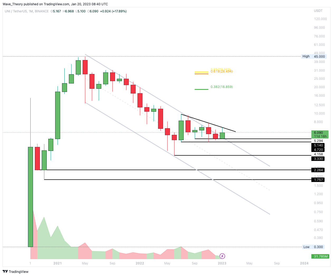 Die letzte UNI Kurs Prognose liegt bereits drei Wochen zurück. Damals schrieben wir: “Der UNI Kurs hat die Fib Unterstützung bei rund 5,4 USD bärisch gebrochen, woraufhin der UNI Kurs jetzt bis zu 36 % fallen könnte. Denn die nächste Unterstützung wartet erst wieder zwischen rund 3,33 USD und 4,06 USD.