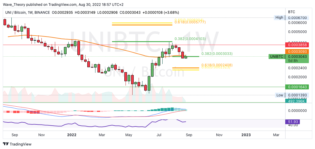 Auch im Wochenchart tickt das Histogramm des MACDs bärisch tiefer. Sollte sich der UNI Kurs jetzt nicht über 0,000303 BTC halten können, könnte der Uniswap Kurs schon bald zur Golden Ratio Unterstützung bei rund 0,00024 BTC korrigieren. Dort könnte der UNI Kurs sehr stark abprallen.