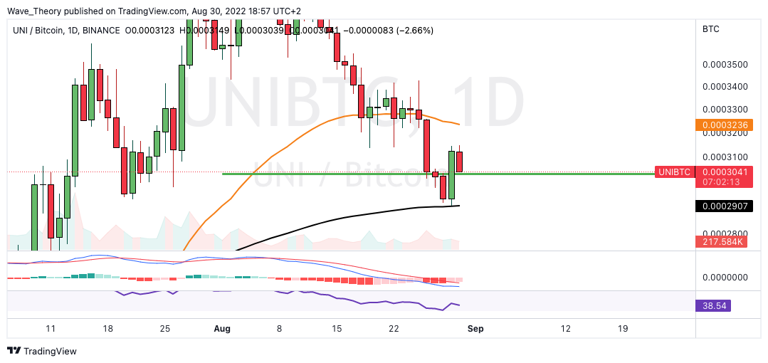 Gegen BTC prallte der UNI Kurs am 200-Tage-EMA ab