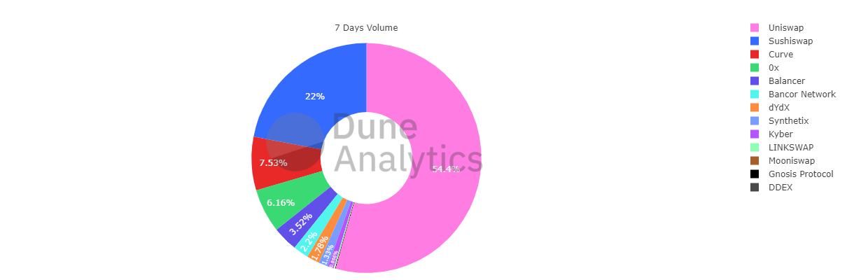 Ferner beinhaltet das Wachstum von Uniswap eine Erhöhung der Liquidität um ca. 25% auf 3,6 Milliarden US-Dollar. Die Popularität gibt Uniswap einen Anteil von 54% am DEX-Markt. Trotz dieser Dominanz gibt es starke Konkurrenz, wie beispielsweise Sushiswap.