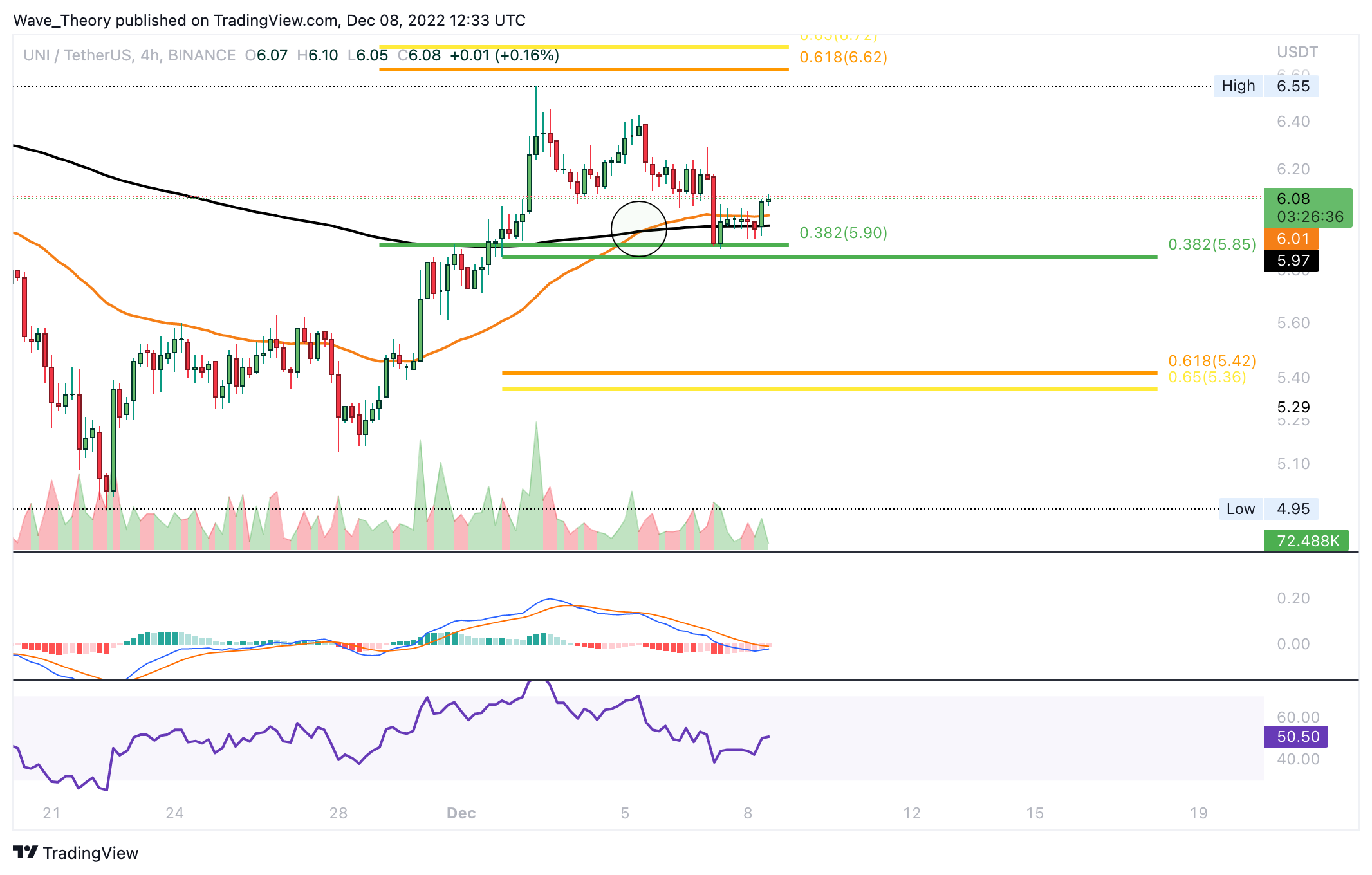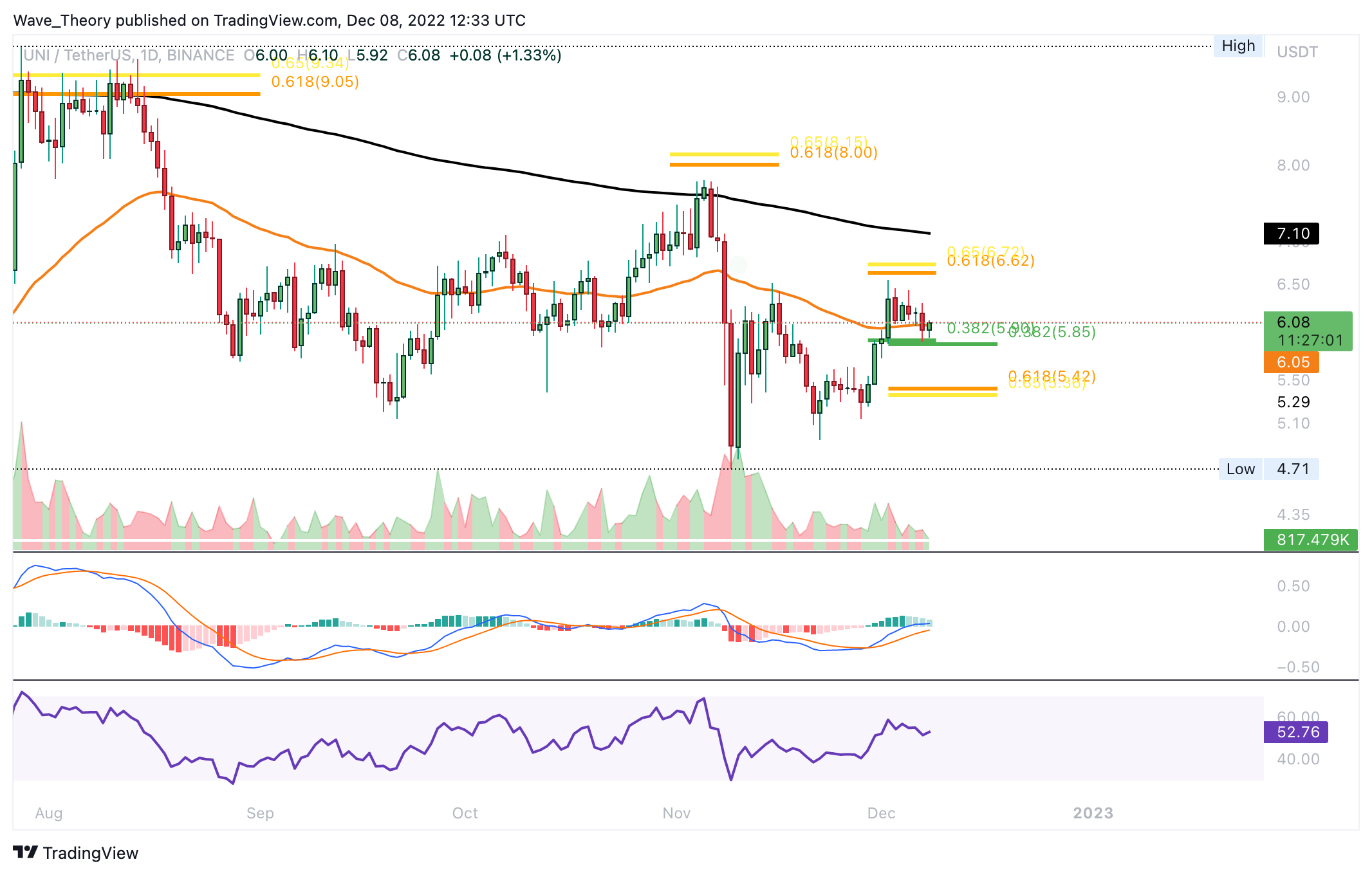 Der UNI Kurs konnte den Golden Ratio Widerstand bei rund 6,8 USD nicht brechen