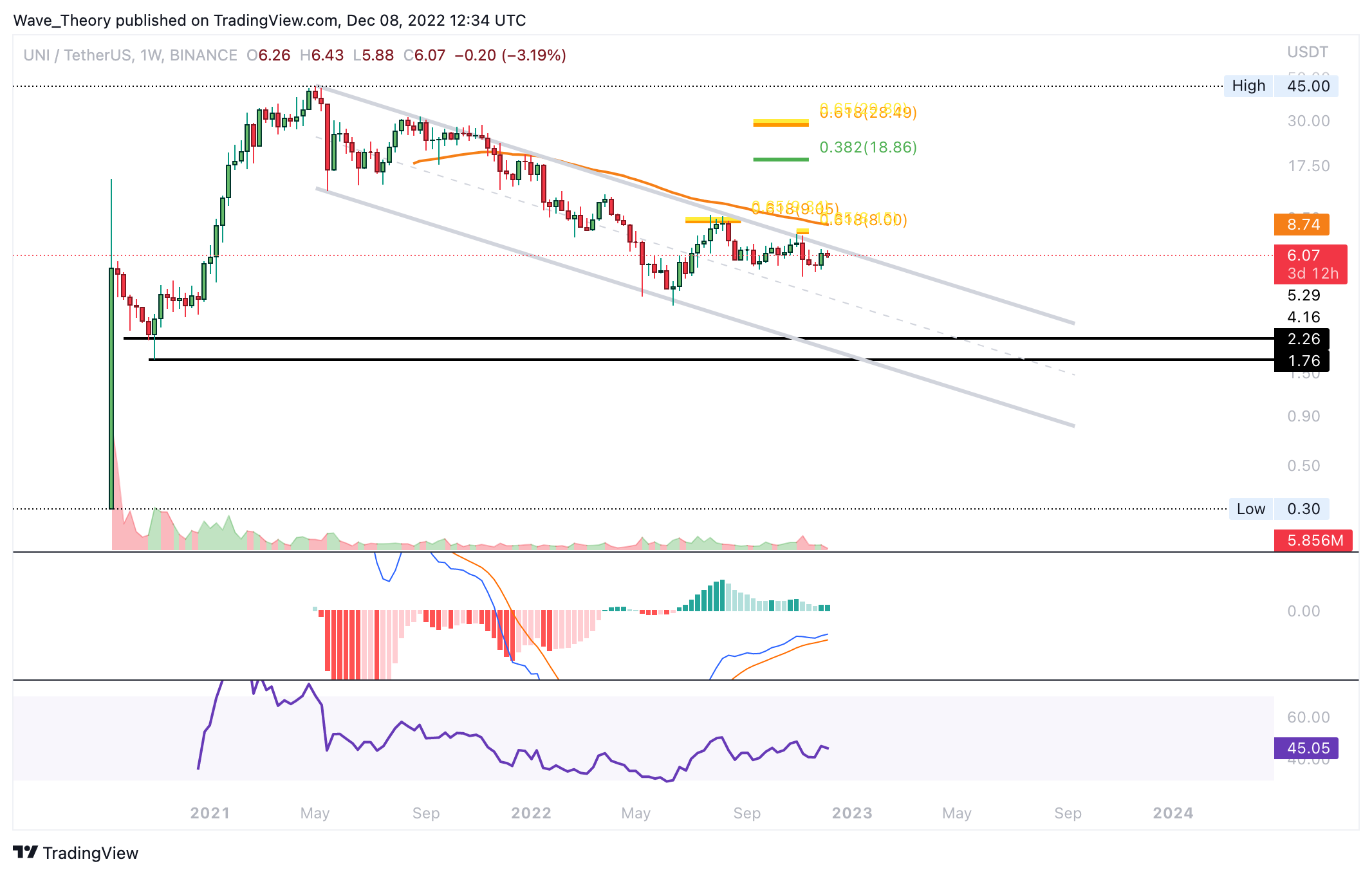 Die letzte UNI Kurs Prognose liegt bereits fast drei Wochen zurück. Damals schrieben wir: ” Der UNI Kurs erreichte 7,8 USD und wurde anschließend stark bärisch abgewiesen. Damit befindet sich der UNI Kurs jetzt in starker Unterstützungszone zwischen 4,16 USD und 5,3 USD. Zudem tickt das Histogramm des MACDs im Wochenchart bärisch tiefer und auch die MACD Linien sind bärisch überkreuzt.