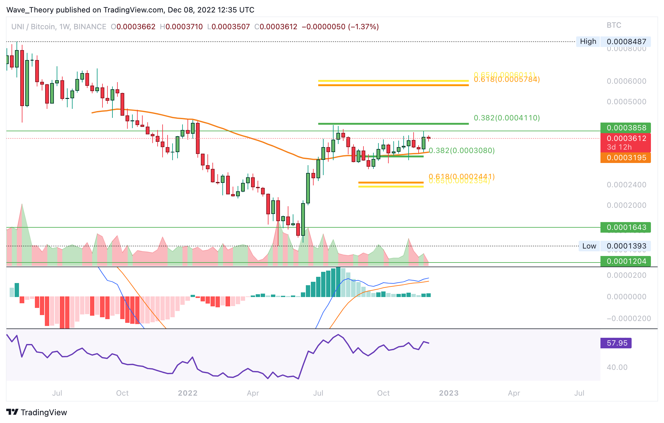 Gegen BTC konnte UNI am 50-Wochen-EMA abprallen