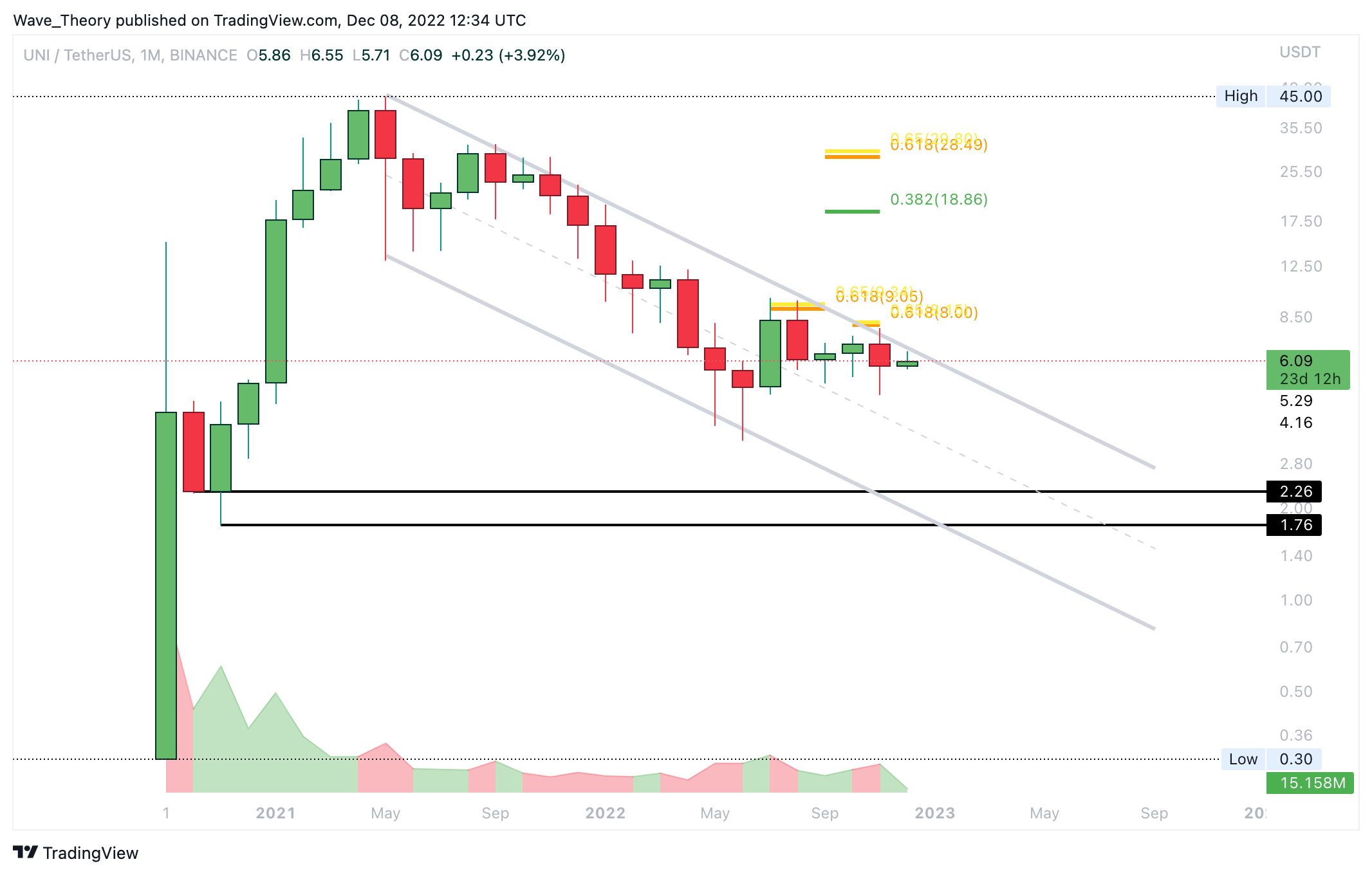 Fällt UNI hingegen erneut unter die 5 USD Marke, findet UNI erst wieder zwischen 3,33 USD und 4 USD signifikante Unterstützung. Bricht UNI auch diese Unterstützung bärisch, wartet erst wieder zwischen 1,76 USD und 2,26 USD signifikante Unterstützung auf den Uniswap Kurs.