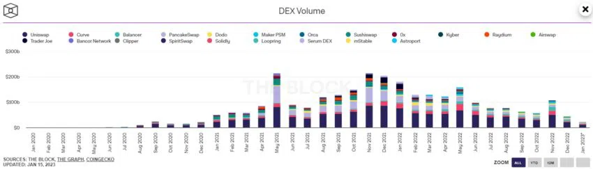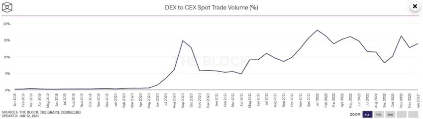 Auch CoinMarketCap stellte in einer Dezember-Veröffentlichung überzeugende Beweise für das zunehmende Wachstum des DEX-Marktanteils fest. Dafür zog die Plattform vor allem die DEX- zu CEX-Spot-Volumen-Verhältnisse von 2022 heran. Die Zahlen für Januar 2023 scheinen jedoch verglichen mit Januar letzten Jahres um einiges niedriger.