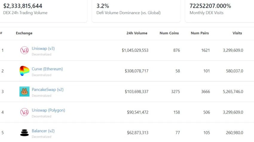 Obgleich Uniswap in diesem Ranking um einiges weiter unten kommt, behält die Plattform mit einem 24-Stunden-Handelsvolumen von 102,6 Millionen US-Dollar dennoch die Führung unter den DEXes.