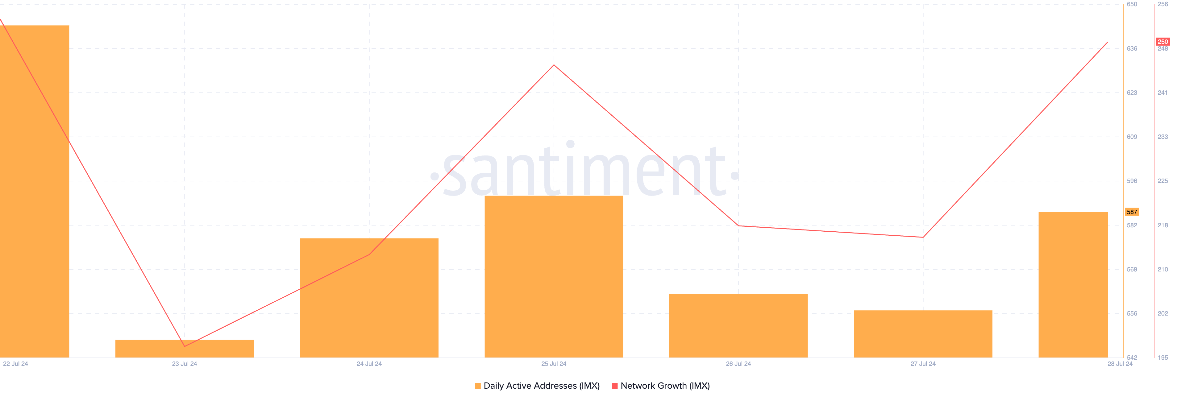 Am Montag verzeichnete der Coin einen Anstieg der Nachfrage, der seinen Kurs in Richtung Widerstand drückte. Laut Daten von Santiment wurden an diesem Tag 697 einzigartige Adressen registriert, die mindestens eine Transaktion mit IMX durchführten, was einen wöchentlichen Höchststand markierte.