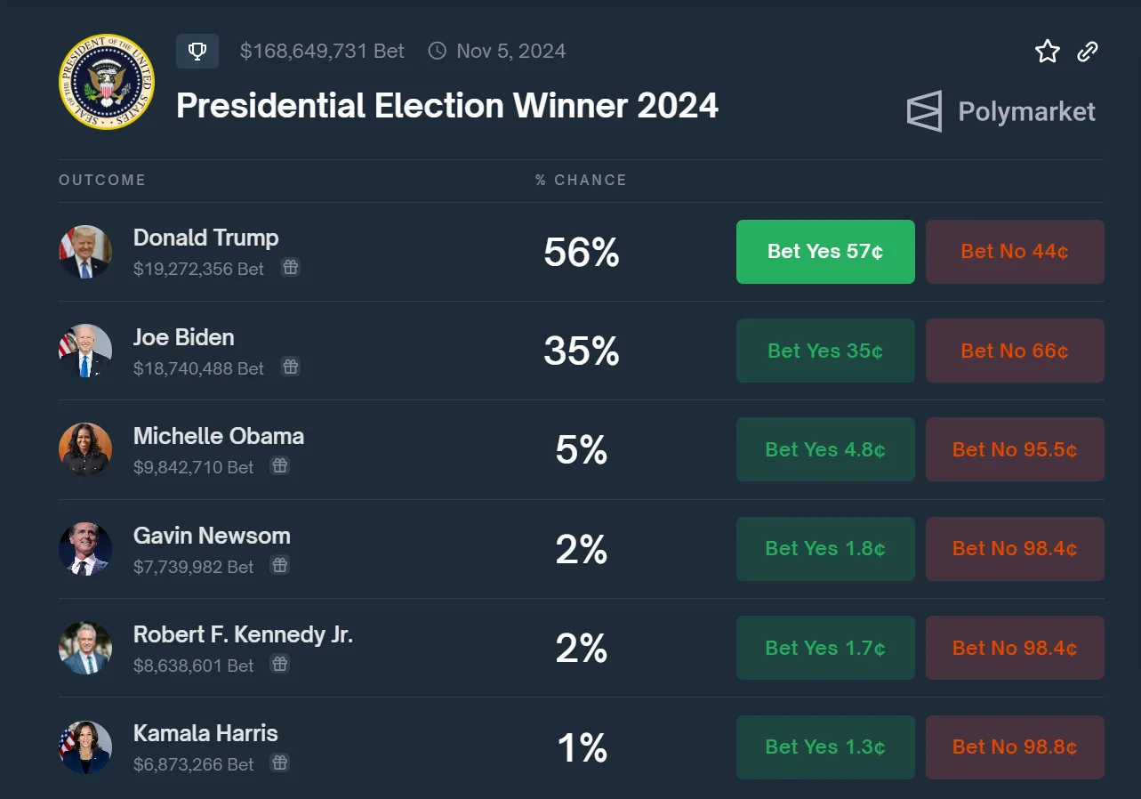 Nach den Quoten der Prognosemarktplattform Polymarket führt Trump mit einer 56-prozentigen Chance, die diesjährige Präsidentschaftswahl zu gewinnen. Biden hingegen hat nur eine 35-prozentige Chance.