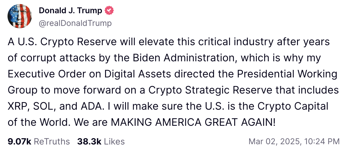 “Eine US-Krypto-Reserve wird diese wichtige Branche nach Jahren korrupter Angriffe der Biden-Administration wieder nach vorne bringen. Aus diesem Grund hat meine Executive Order zu Digital Assets die Presidential Working Group angewiesen, eine Strategische Krypto-Reserve einzurichten, die auch XRP, SOL und ADA beinhaltet“, schrieb er in einem Beitrag auf Truth Social. „Ich werde dafür sorgen, dass die USA die Krypto-Hauptstadt der Welt werden.”