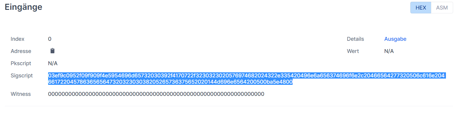 Ruft man die Coinbase-Transaktion des Blocks in einem Block-Explorer auf, wird die Signatur anzeigt. Diese enthält die Botschaft als hexadezimalen Zahlenwert. Mit einem einfachen Tool kann man sie wieder in Klarschrift entschlüsseln.
