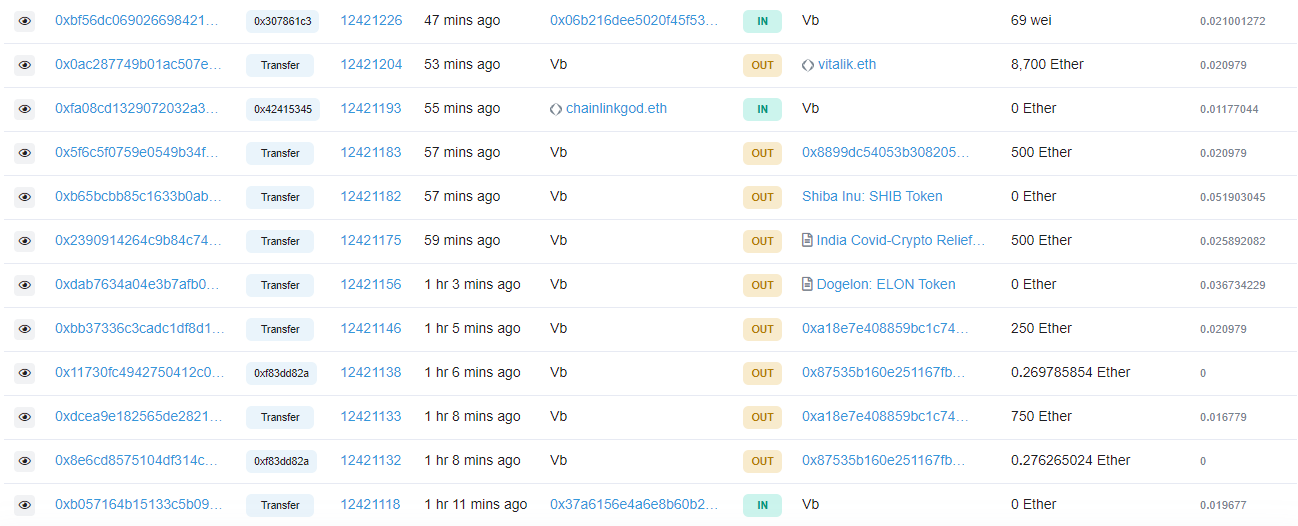 Und auch der selbsternannte Dogecoin-Konkurrent Shiba Inu (SHIB) reiht sich in die Projekte ein, die einen nicht unerheblichen Teil der eigenen Token an Buterin überwiesen. Auf Vitalik Buterins Wallet lagerten zeitweise mehr als zwei Billionen Shiba Inu Token, was insgesamt mehr als 40 Millionen US-Dollar entspricht. Während vor allem Shiba Inu von dem aktuellen Altcoin-Pump und der Dogecoin-Manie profitierte, beeinflusste Buterin den SHIB Preis durch den Abverkauf via Uniswap erst einmal deutlich negativ. In den letzten 24 Stunden verlor Shiba Inu fast 30 Prozent an Kaufkraft (zum Zeitpunkt des Schreibens).