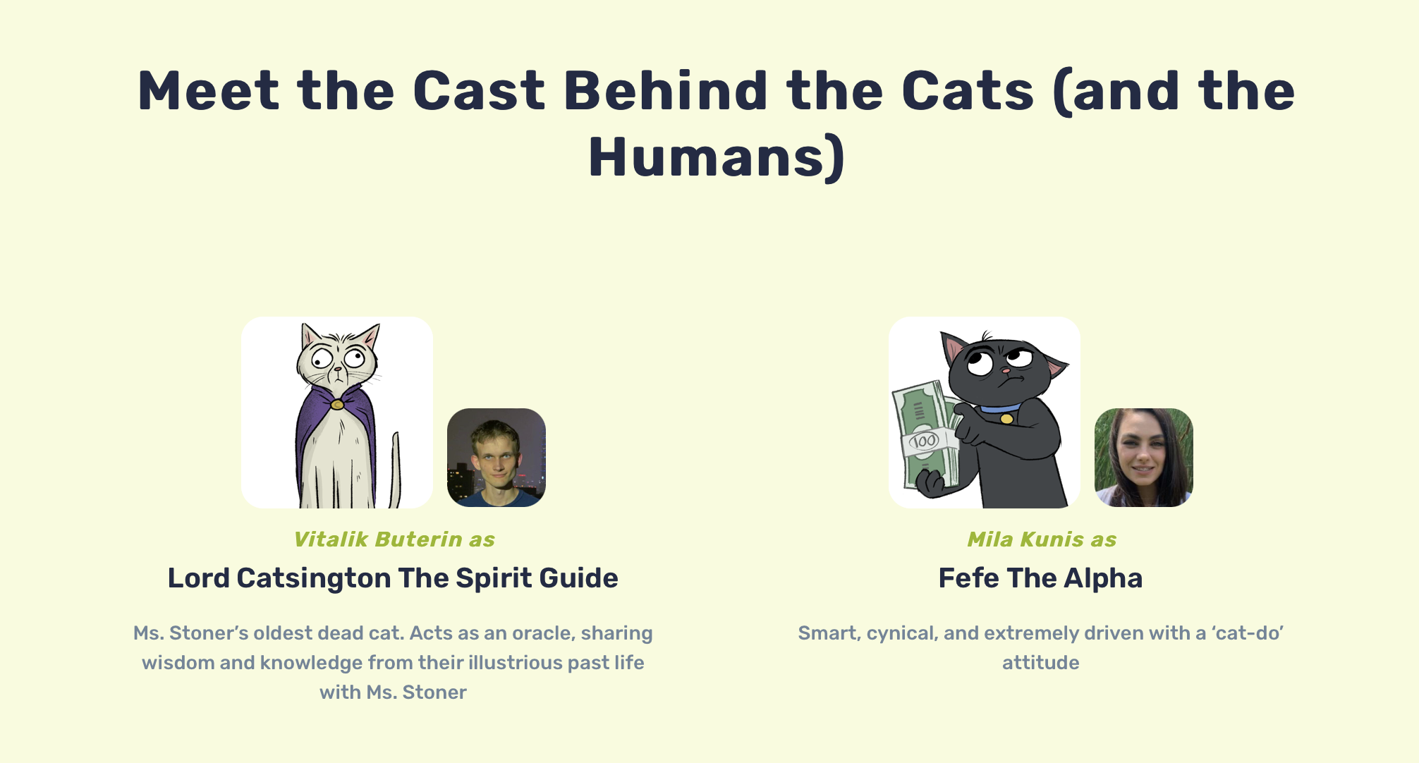 Im Gegensatz zu Stoner Cats werden CryptoKitties jedoch nicht mit zusätzlichen Medien ausgeliefert. Doch was das Projekt wirklich interessant macht, ist der Cast. Da haben wir zum einen Mila Kunis und Ashton Kutcher. Chris Rock und Jane Fonda. Seth MacFarlane und – jetzt halte man sich fest: Vitalik Buterin. Buterin wird als Sprecher von Lord Catsington aufgeführt, einer alten taxidermischen Katze, die den anderen Katzen in der Serie Weisheit und Ratschläge gibt.