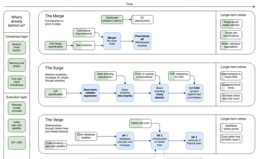 Der Roadmap von Buterin zufolge wird sich Ethereum nach dem Merge auf die Skalierbarkeit mithilfe von Sharding fokussieren. Anschließend werden weitere Verbesserungen durch The Verge und The Purge eingeführt. Diese Schritte werden die Validierung verbessern und die Datenlast der Nodes verringern. Der kanadische Programmierer geht allerdings auch davon aus, dass nicht alle Schritte der Roadmap auch tatsächlich implementiert werden müssen.