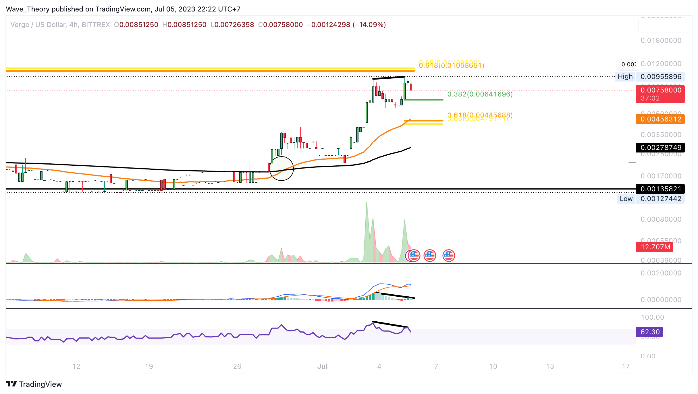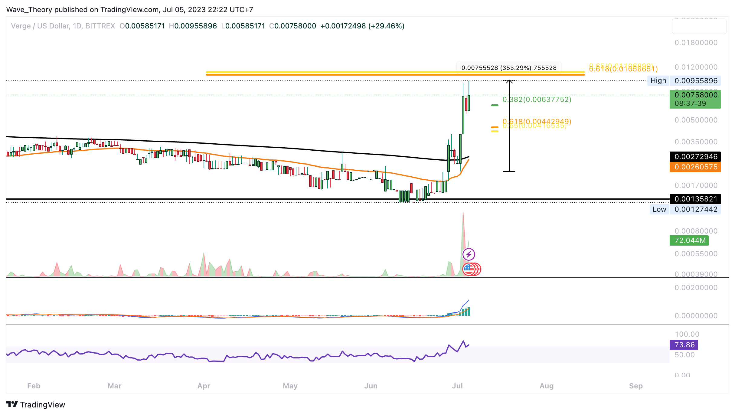 Darüber hinaus stößt Verge jetzt schon bald auf signifikanten Golden Ratio Widerstand bei rund 0,011 USD. Sollte Verge dort bärisch abgewiesen werden, warten bei rund 0,00637 USD und bei rund 0,0044 USD die nächsten signifikanten Fibonacci Unterstützungen.