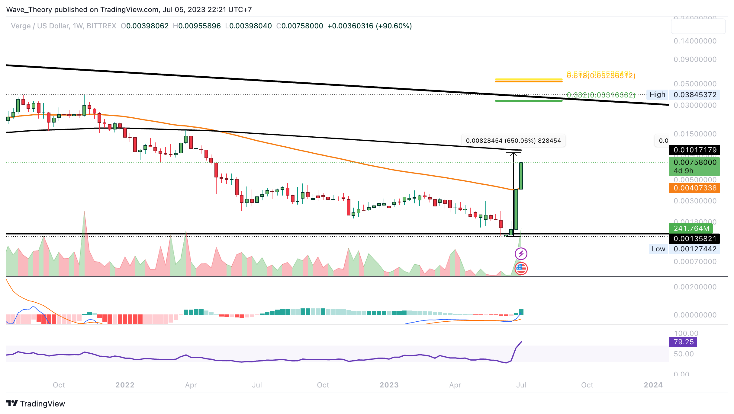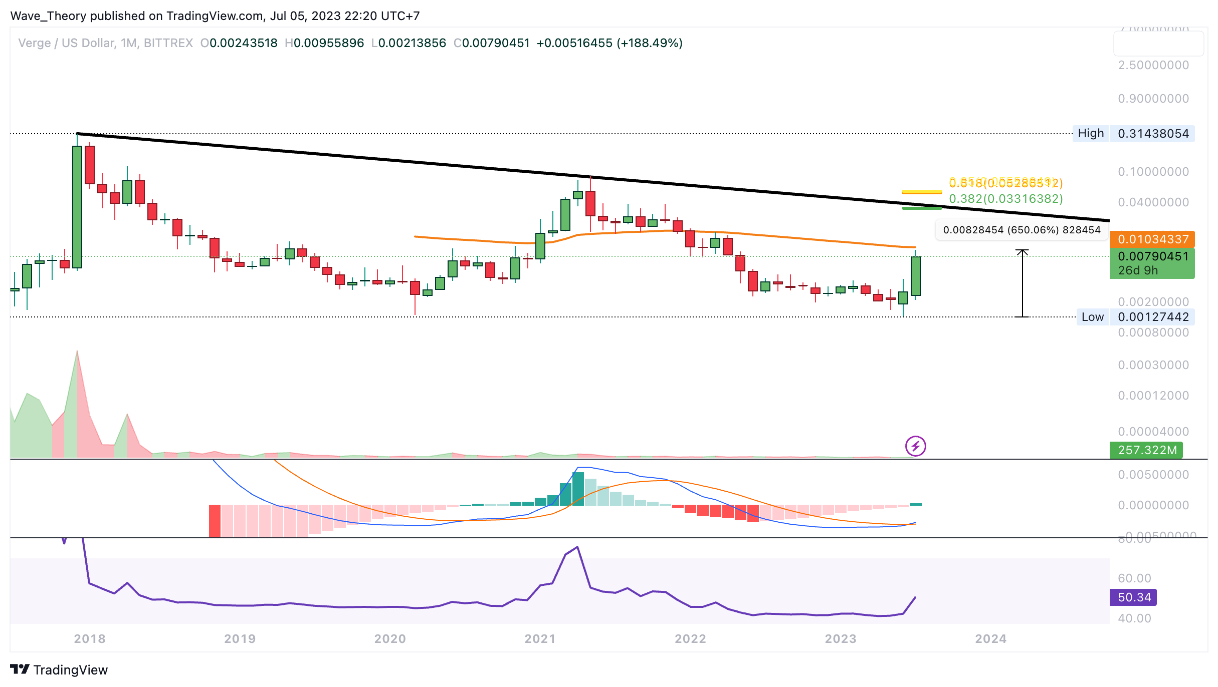 Denn zwischen den Fib Niveaus liegt zudem die bärische Trendlinie des gesamten Bärenmarktes. Mit einem bullischen Bruch könnte Verge eine bullische Trendwende initiieren.
