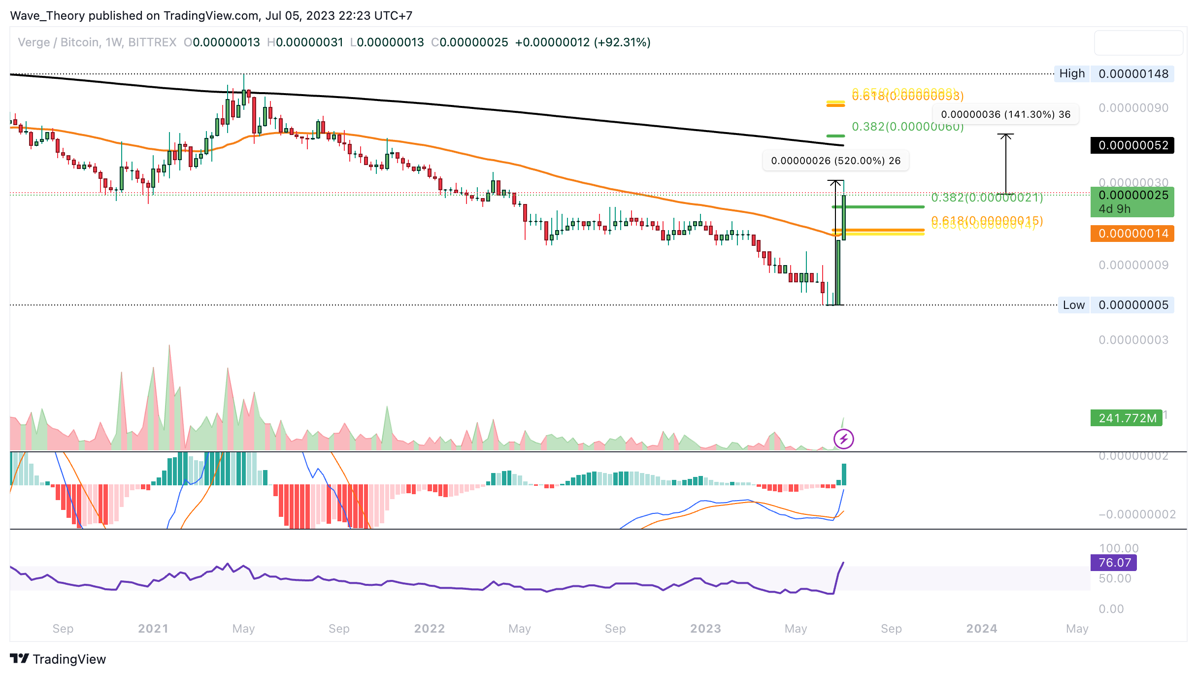 Zudem konnte XVG bereits den 50-Wochen-EM Widerstand bei rund 0,00000014 BTC brechen, welcher nun als Unterstützung dient. Dort liegt zudem signifikante Golden Ratio Unterstützung. Wenn XVG jetzt korrigiert, findet er aber bereits bei rund 0,00000021 BTC signifikante Fib Unterstützung.