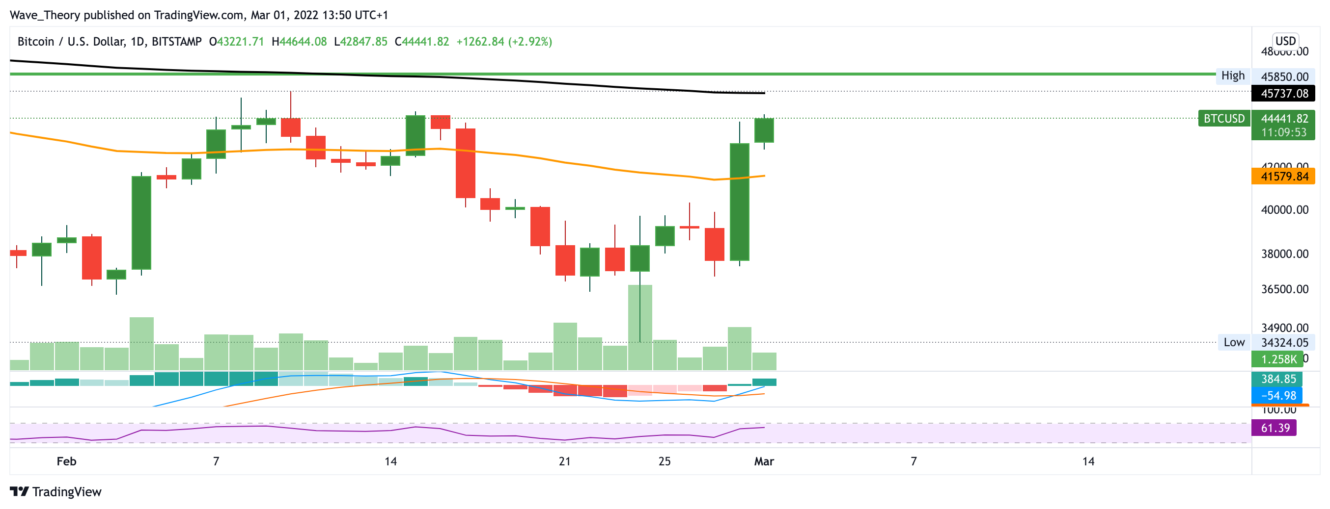 Auch im Tageschart sieht es aktuell sehr bullisch aus. Das Histogramm des MACDs tickt bullisch höher, während die MACD Linien bullisch überkreuzt sind. Es bleibt abzuwarten, ob Bitcoin nun den Widerstand am 0,382 Fib Niveau bei rund 47.000 USD hinter sich lassen kann.