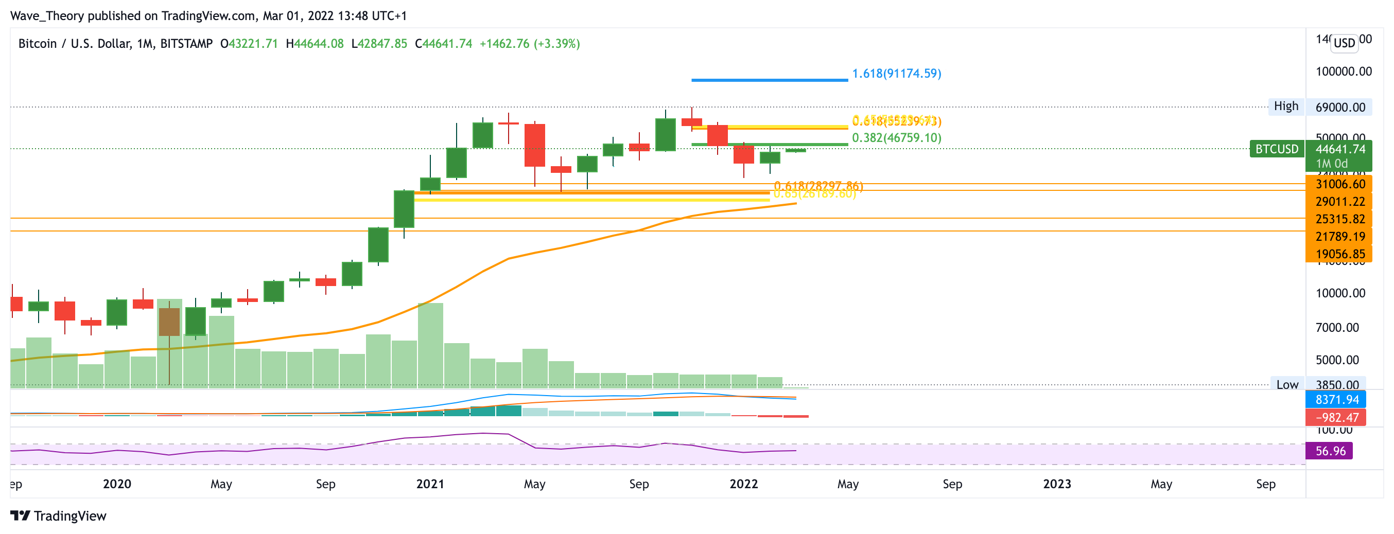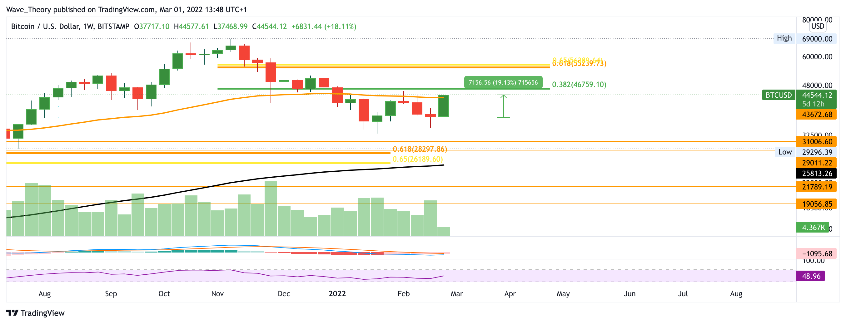 Nun beginnt Bitcoin die neue Woche sehr bullisch und insbesondere gestern verzeichnete Bitcoin bereits einen Anstieg von rund 18 %, an welchem er heute anzuknüpfen scheint. Damit befindet sich Bitcoin nicht mehr weit entfernt vom 0,382 Fib Niveau bei rund 47.000 USD. Bricht Bitcoin diesen Widerstand, so könnte er bis rund 56.000 USD steigen, wo er auf den entscheidenden Schlüsselwiderstand der Golden Ratio stößt. Dort angekommen, könnte Bitcoin seine Korrektur endgültig beenden und eine bullische Trendwende vollziehen, sofern Bitcoin das Preisniveau bei rund 56.000 USD nachhaltig bricht. Dann findet Bitcoin erst wieder am Allzeithoch bei rund 69.000 USD signifikanten Widerstand. Ist dieses Preisniveau erst einmal gebrochen, so hindert Bitcoin nichts mehr an einem Anstieg zur langersehnten 100.000 USD Marke.