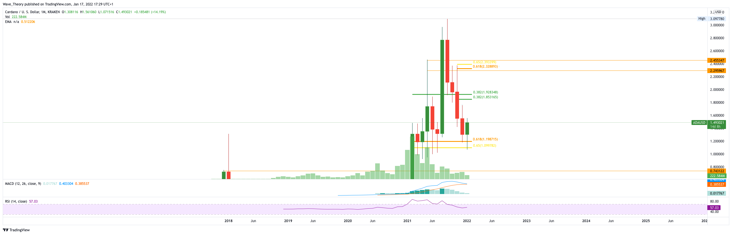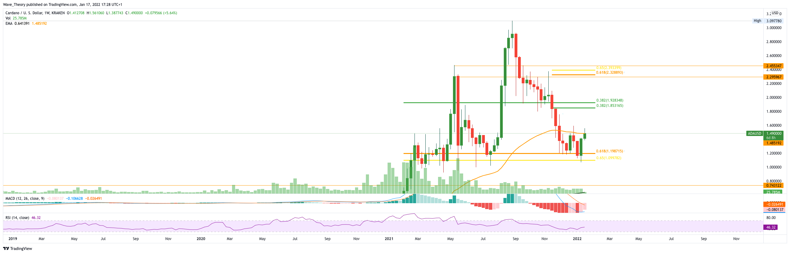 Bevor der Cardano Kurs jedoch die wichtigen Fibonacci Niveaus erreicht, muss er zunächst am 50-Wochen-EMA vorbei. Dieser Widerstand liegt am aktuellen Preisniveau von rund 1,5 USD. Auch im Wochenkurs zeigt sich der MACD tendenziell bullisch, denn das Histogramm tickt bullisch höher. Sollte Cardano jedoch nun am 50-Wochen-EMA bei rund 1,5 USD abgewiesen werden, könnte er zur Golden Ratio Unterstützung bei rund 1 USD zurückkehren.