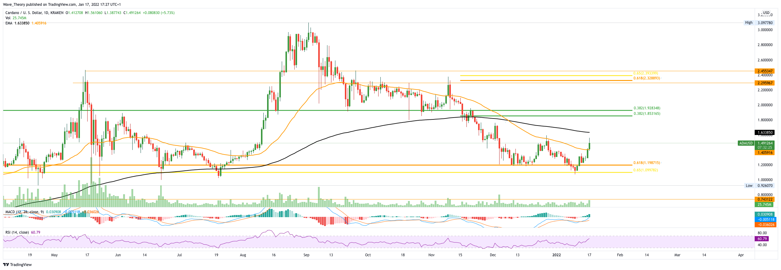 Der Cardano Kurs prallt aktuell stark an der Golden Ratio Unterstützung bei rund 1 USD ab. Infolgedessen konnte der ADA Kurs bereits den 50-Tage-EMA Widerstand überwinden und ist damit nicht mehr weit entfernt vom 0,382 Fib Widerstand bei 1,85 USD. Sollte Cardano diesen Widerstand brechen, könnte er sogar bis rund 2,4 USD steigen, wo der wichtige Golden Ratio Widerstand auf Cardano wartet. Bricht Cardano diesen ebenfalls, ist die Korrekturphase beendet und Cardano könnte sich zu neuen Hochpunkten aufmachen. Im Tageskurs zeigt sich der MACD stark bullisch: Die MACD Linien sind bullisch überkreuzt und das Histogramm tickt bullisch nach oben.
