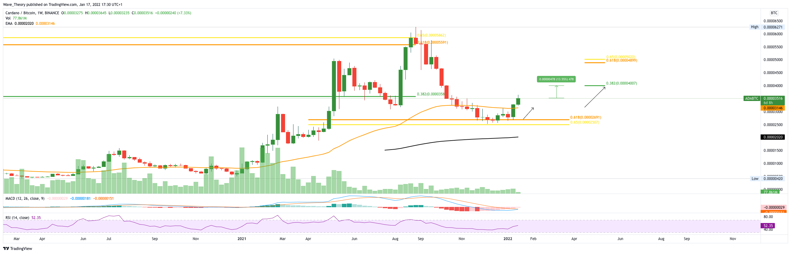 Auch gegen BTC prallt der Cardano Kurs stark von der Golden Ratio Unterstützung ab. Dort konnte Cardano den 50-Wochen-EMA sogar bereits brechen und der ADA Preis befindet sich damit auf dem Weg zum 0,382 Fib Widerstand bei 0,00004 BTC. Das impliziert ein Aufwärtspotenzial von rund 14 % und sollte Cardano auch diesen Widerstand brechen, könnte Cardano sogar rund 42 % zur Golden Ratio bei 0,0005 BTC steigen.