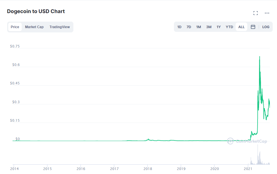 Auch beim Dogecoin Kurs kannst du die Auswirkungen des immer größer werdenden Netzwerkes sehen. Der durch Elon Musk ausgelöste Hype um den Memecoin und der Netzwerkeffekt sorgten dafür, das der Dogecoin Preis zwischen Anfang Januar 2021 und Mai 2021 um den Faktor 146 gestiegen ist. Als der Hype aufhörte, fiel der Doge Kurs jedoch wieder deutlich ab. Daran kannst du auch erkennen, warum der Handel mit Kryptowährungen sehr riskant sein kann.