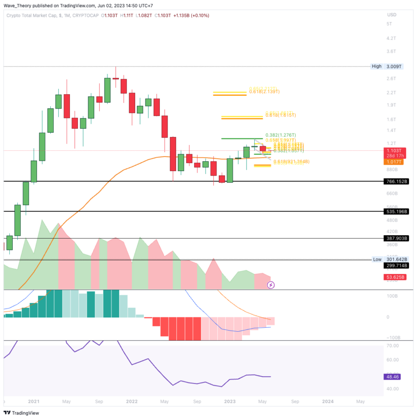 Entweder bricht der Krypto-Markt jetzt den Golden Ratio Widerstand bei rund 1,118 Billionen USD, um zur nächsten Golden Ratio bei rund 1,14 Billionen USD zu steigen. Oder der Kurs wird daran bärisch abgewiesen, um zur 0,382 Fib Unterstützung bei rund 1,05 Billionen USD zu korrigieren.