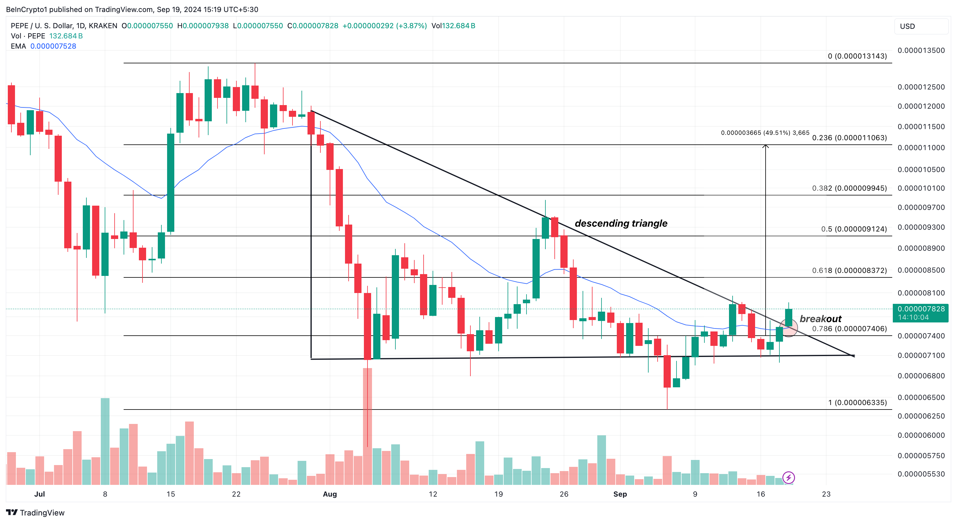 Zusätzlich zum Kaufvolumen auf dem 4-Stunden-Chart zeigt auch der tägliche PEPE/USD-Chart ein bullisches Bild. Beispielsweise bildete der Memecoin zwischen dem 30. Juli und gestern ein absteigendes Dreieck.