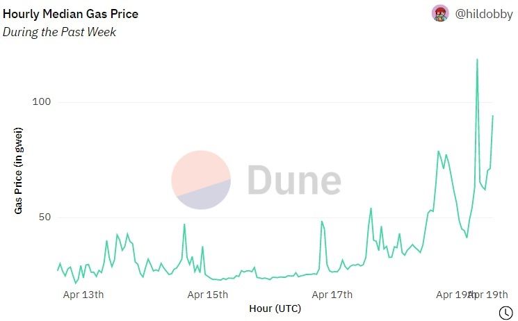 Des Weiteren führte die starke Nachfrage der Bots auch zu einem rasanten Anstieg der ETH-Transaktionskosten. Während der Median des Gaspreises in den letzten Tagen zwischen 25 und 50 Gwei schwankte, stieg dieser am 19. April 2023 sprunghaft auf 119 an – wohl auch wegen der von den Bots gezahlten Transaktionsgebühren am selbigen Tag.