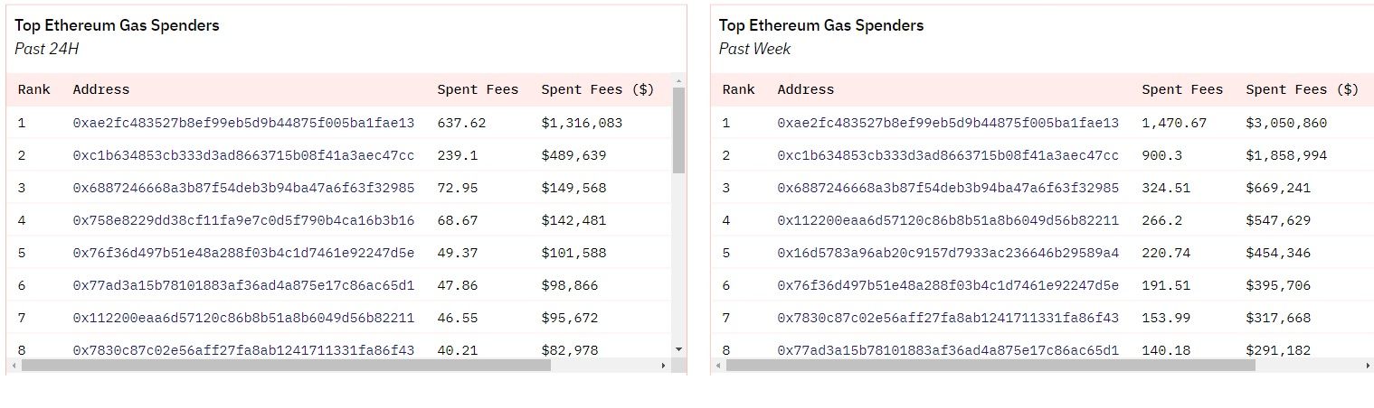 Darüber hinaus sorgten die Bots für einen enormen Anstieg der Ethereum-Transaktionsgebühren (auch Gas-Fees genannt). Schließlich zahlten sie extra Gebühren zahlten, um vor anderen Käufer:innen zu kaufen. Wie Daten von Dune-Analytics zeigen, ist die mit den Bots verbundene Adresse derzeit die Adresse, die mit Abstand am meisten Gasgebühren zahlt. Zum Zeitpunkt der Erstellung des Artikels belaufen sich die Gebühren auf 1,3 Millionen US-Dollar in den letzten 24 Stunden und über 3 Millionen US-Dollar in den vergangenen sieben Tagen. Die täglichen Ausgaben der Bots sind damit größer als die des Arbitrum-Netzwerks, der derzeit beliebtesten Layer-2-Lösung für Ethereum.
