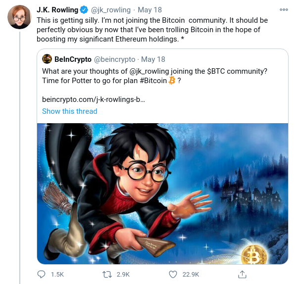 Eines der anschaulichsten Beispiele für die Erklärung von Bitcoin in diesem Jahr ist sicherlich J.K. Rowlings Bitte an ihre Follower, den Kosmos der Kryptowährungen zu erklären.
